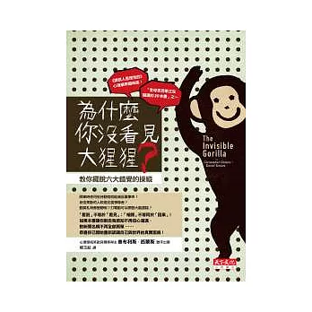 《為什麼你沒看見大猩猩?》這本書講的是深深影響我們日常生活的六大錯覺:有關注意力、記憶、自信、知識、因果以及潛能六大層面。書中集結各項心理學領域的研究成果,揭發許多日常生活中時而可見但人們卻完全沒有意識到的錯覺與邏輯謬誤。作者舉出許多反直覺性的科學研究證據,告訴我們:「看見」不等於「看到」。我們只看見我們想看見、所預期看到的一面,而遺漏了許多就出現在眼前但卻未進入意識層面的真相。